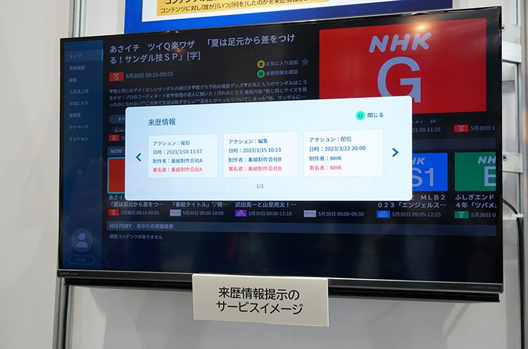 コンテンツの信頼性確保を目的とした「来歴情報提示技術」は、各コンテンツの制作者や編集履歴などの来歴情報をコンテンツに付与するというもの。来歴情報にデジタル署名を付加することで高い信頼性を備え、ユーザーはコンテンツ視聴の際に来歴情報を確認して、信頼度を判断することができる。