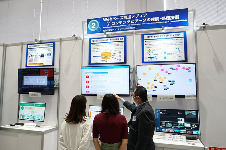 隣接ブースでは、Webベース放送メディアを活用したコンテンツとデータの連携・処理技術について展示。今回は、教育コンテンツから単語間の意味関係を抽出してグラフ構造化する「ナレッジグラフ」を活用し、各コンテンツを「学び」の観点で連携、よりユーザーに興味の広がりを提供するという試作システムが紹介されていた。