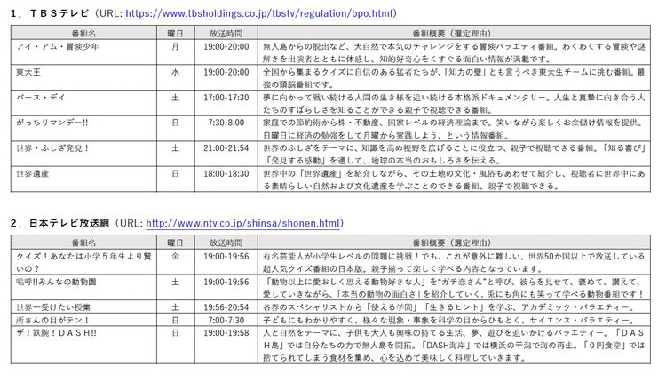 日本民間放送連盟(民放連)は、民放連会員のテレビ社(139社)が2023年春改編期にあたって選定した、「青少年に見てもらいたい番組」を発表した。