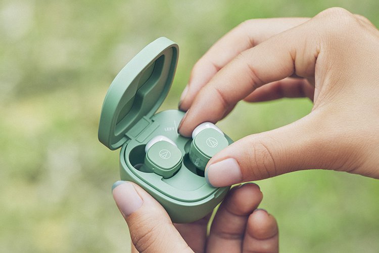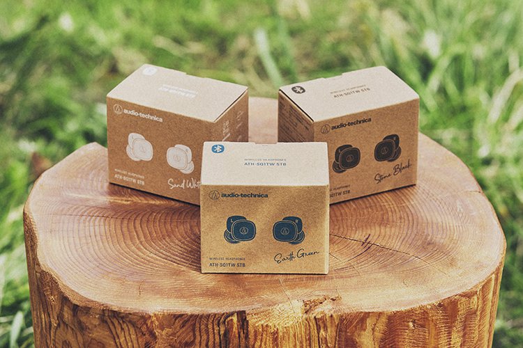ATH-SQ1TW STBは、小型軽量設計で個性的なスクエアデザインが特徴の完全ワイヤレスイヤホン「ATH-SQ1TW」をベースに、イヤホンと充電ケースに環境に配慮したPCR(Post-Cosumer Resin)プラスチックを使用した新モデル。