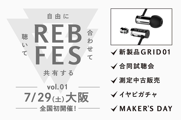 イベント当日には、REBの新モデル「GRID01(グリッド01)」の先行試聴を実施する。「GRID01」は、分解を必要としないMAKEシリーズを含め、過去最多の10万通り以上のチューニングが行えるREB初の製品化モデル。ノズル交換とフィルターを使ったチューニングに、複雑な分解を一切必要としないため、初めてのチューニングにチャレンジできるイヤホンとアピールしている。