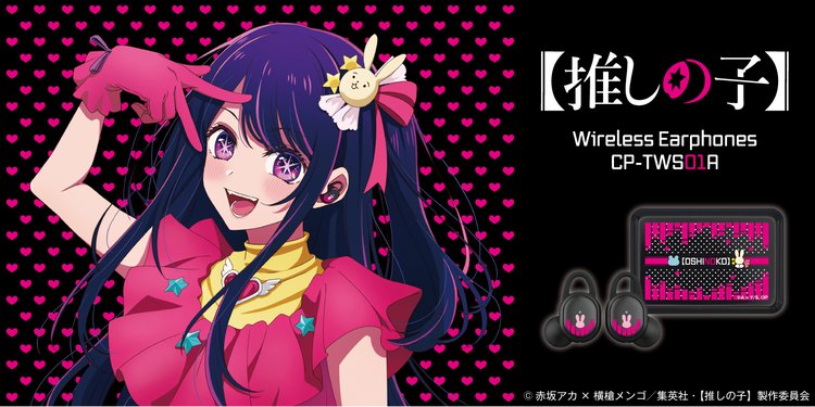 同社の完全ワイヤレス「CP-TWS01A」をベースに、作品の世界観を表現したオリジナルデザインを採用。普段使いしやすいポップなデザインだとしている。また、音声ガイダンスには作中キャラ・B小町 アイの新規録り下ろしボイス全7種類を採用。パッケージにも描き下ろしのイラストを採用している。