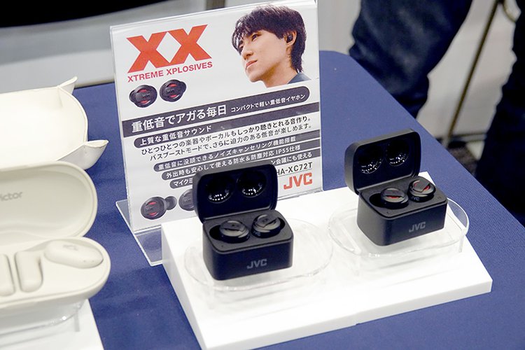 そしてJVCブランドからは、重低音が特徴である“XX”シリーズの完全ワイヤレスイヤホン「HA-XC72T」を展示。ケンウッドブランドでは「KH-BIZ70T」を用意し、マルチポイント対応やマイクミュート機能などビジネス用途でも活躍するモデルであることをアピールするなどしていた。