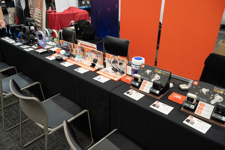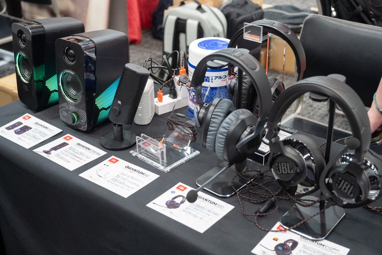 JBLのブースでは、各種完全ワイヤレスイヤホンからゲーミングヘッドセットまで幅広く展示。このうち大きな注目を集めていたのが、充電ケースに “ディスプレイ” を搭載した完全ワイヤレスイヤホン「TOUR PRO 2」だ。また、「LIVE FREE 2 TWS」や「TUNE FLEX」などの完全ワイヤレスイヤホンもラインナップされており、各モデルを横並びで試聴できる。