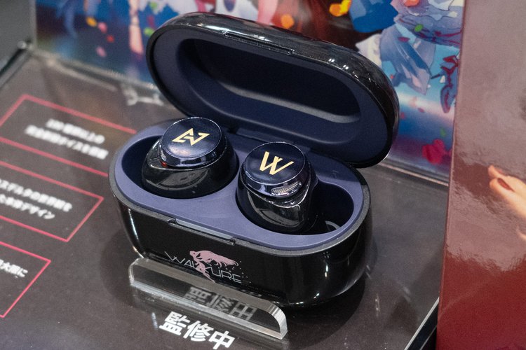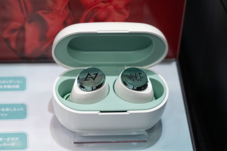 続いてAVIOTのブースでは、完全ワイヤレスイヤホンの各種コラボレーションモデルが展示。たとえば、『マクロスΔ』に登場する戦術音楽ユニット「ワルキューレ」とのコラボ完全ワイヤレスイヤホン「TE-D01v-MCD」が展示されている。