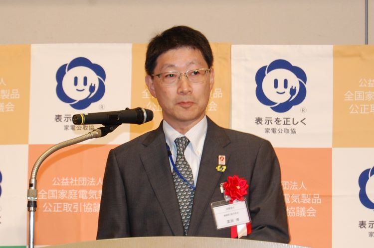 来賓挨拶では、消費者庁 審議官・真渕博氏が、「豊かな生活を享受できる家電製品が次々に出てくるなか、一般消費者が適切な商品選択をするためには、まずは適正な表示が大前提として不可欠。その点において、協議会で運用されている公正競争規約は大変重要になる」とあいさつ。続けて、違反行為に対する抑止力の強化等を目的とした景品表示法の改正について説明した。