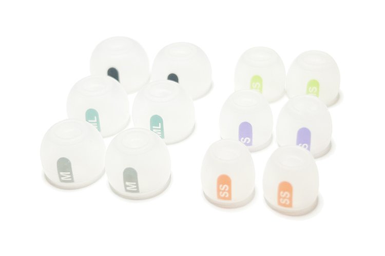 サイズは印字だけでなく、帯の色の違いからも識別できる視認性の高いデザインを採用。幅広いサイズに対応する3サイズ/1ペアずつのアソートタイプと、各サイズ2ペア(4個入り)ずつのサイズ単体を販売する。アソートタイプのみイヤーピースケースが付属する。
