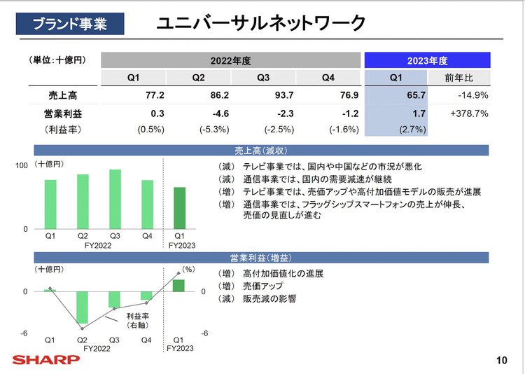 ブランド事業のユニバーサルネットワークでは、売上高がテレビ事業、通信事業ともに減収、前年同期比14.9%減の657億円に。テレビ事業は売価アップや高付加価値モデルの販売が進展したが、国内や中国などの市況が悪化し減少した。通信事業ではフラグシップスマートフォンの売上げが伸長し、売価の見直しも進んだが、国内需要の減速が継続した影響を受けた。