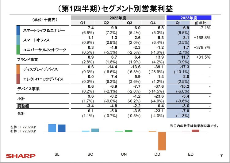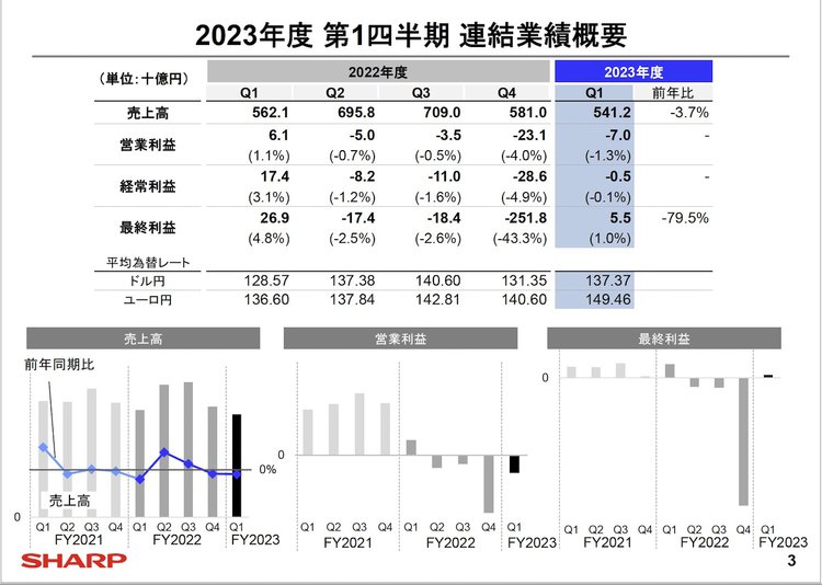 シャープの2023年度1Q決算、ディスプレイ事業が大幅減も連結業績は22年度4Q比で改善