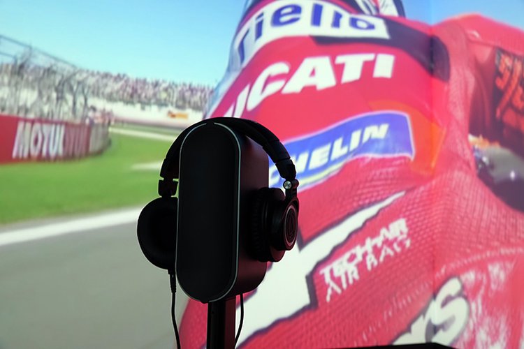 ブース内には、バイクレースの臨場感を大画面映像とともにヘッドホンで体験できるデモシアターも用意。モータースポーツ人気が高いヨーロッパらしい展示を行っている。