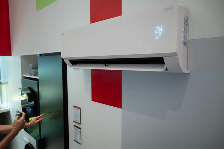 奥に進むと、ThinQホームゾーンというエリアがあり、同社コネクテッド技術の最新バージョン「LG ThinQ UP 2.0」を搭載した家電をデモ。ユーザーに合わせたパーソナライズに対応しており、たとえば洗濯機ではアプリからアンケートに答えることで、洗濯サイクルを最適化できるという。同様に冷蔵庫では、アプリから食品の種類に応じて温度を制御したり、ドアに組み込まれたLED証明の色を変更できるとのこと。