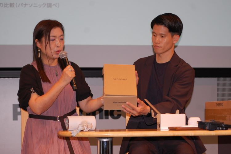 パナソニック(株)ビューティ・パーソナルケア事業部 ヘアケア商品企画部・中尾彰氏が紹介したのはヘアードライヤー ナノケア「EH-NA0J」。「お客様が手で触れるところには環境への配慮があった方がいいと考えました」と、植物由来の塗料「バイオマスペイント」を採用する。