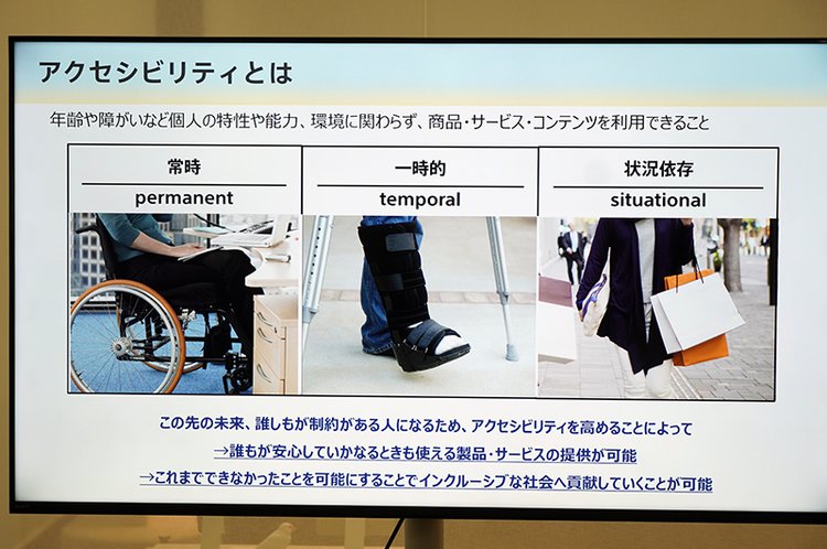 アクセシビリティとは、年齢や障がいといった個人の特性、能力、環境に関わらずに商品やサービス、コンテンツを利用できること。高齢者や障がいのある方の常時制約のみならず、怪我などによる一時的制約、カバンを持って手が塞がる状況依存など、「誰しもが制約がある人になり得る」と注目する。