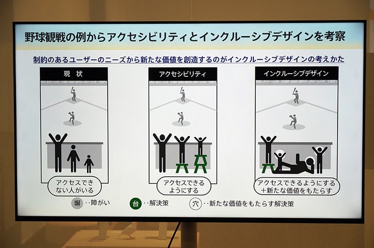 「制約のあるユーザーのニーズから新たな価値を創造できる」ことも強調。野球観戦を例に挙げ、身長差に左右されずに誰もが観戦できる環境や仕組みを構築することで、新しい角度の観戦が可能になるという。