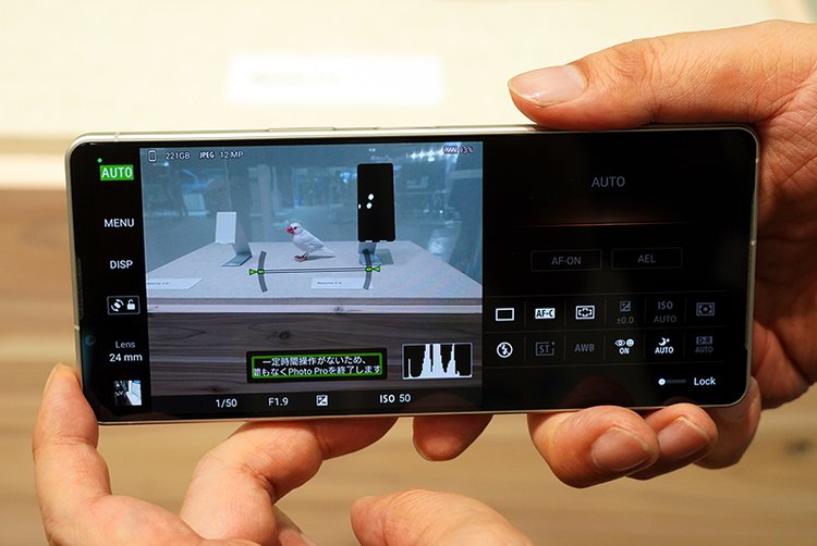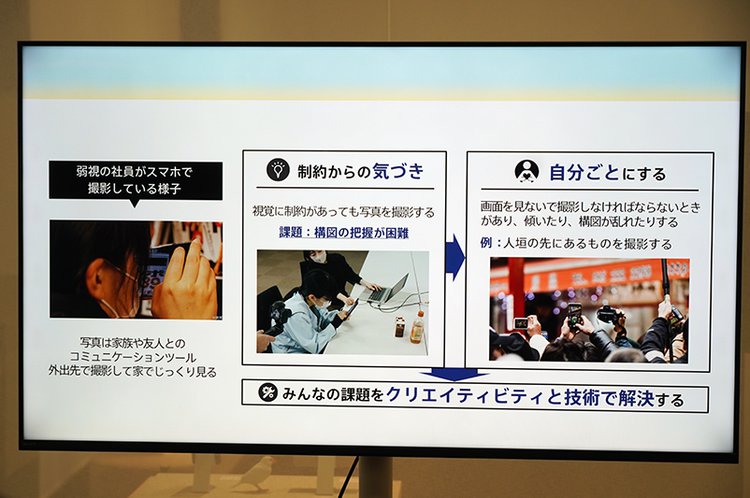 「インクルーシブデザインの取組み」では、障がいのある社員が活躍するソニー・太陽とXperiaチームがコラボレーションした、使用時に水平が保たれているかどうかを音で通知するフォト撮影機能「Photography Pro(フォトグラフィー プロ)」の実機デモを実施。Xperiaを使用して写真を撮影すると、水平になった瞬間に特定の音で知らせてくれる様子が確認できた。