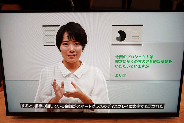 内蔵マイクから拾った音声を即時に文字変換し、スマートグラス型ディスプレイに表示できるというもの。話相手とお互いの顔を見ながら自然にコミュニケーションを取ることができ、リアルタイム翻訳機能を組み合わせれば外国人とのコミュニケーションにも活用できる。