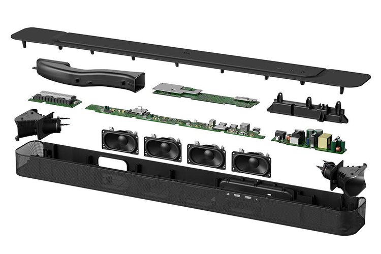 現行モデル「Bar 5.0 MultiBeam」の後継機として位置づけられる5chサウンドバー。高さ56mm、横幅820mmの筐体に6基のスピーカーを内蔵している。スピーカー構成は4基の46×90mm径レーストラック型ユニットと、左右両端に20mm径ビームフォーミングトゥイーター2基を搭載した独自の2ウェイで、各スピーカーユニットには独立して駆動するための総合出力260Wの6chアンプを搭載する。