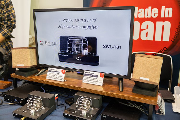 Sound Warriorは、先日発表された小型真空管アンプ「SWL-T01」と木製のキューブ型スピーカー「SW-SP2」を展示。SWL-T01は前段に真空管(12AU7)、後段はD級アンプというハイブリッド構成で、DAコンバーターも内蔵。ヘッドホン再生はもちろん、木製スピーカーとの組み合わせで、「インテリアにも馴染む」シンプルなオーディオスタイルが実現できるとアピールする。