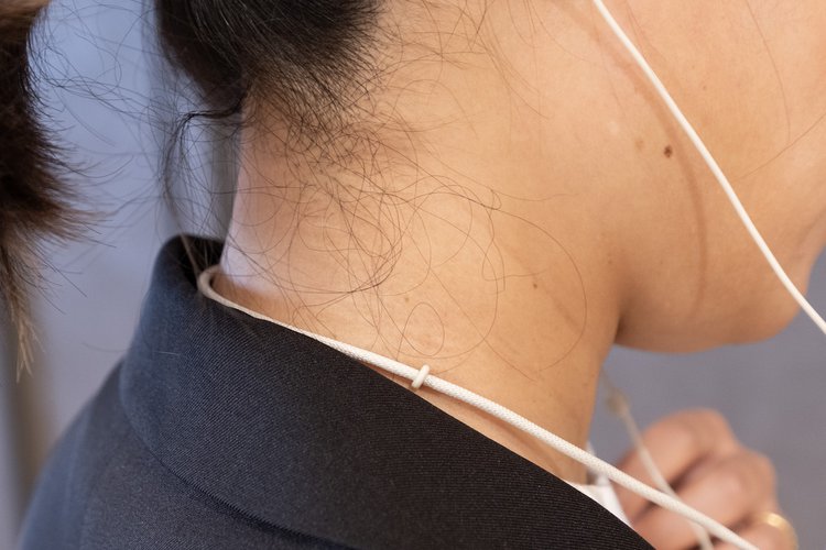 特にこだわった点として「装着感」を挙げており、ネックバンド部には丈夫で肌触りのソフトなナイロン素材を採用。ネックバンド部はあえて長めに設計し、バッテリーや操作部を鎖骨のあたりに乗せることで、重さが首だけではなく体全体に分散するような構造になっている。