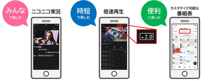 株式会社ドワンゴが提供するリアルタイムコミュニケーションサービス「ニコニコ実況」との連携機能も新たに搭載。視聴画面で「ニコニコ実況」を選択することで、放送中のテレビ番組や起きているイベントに対してコメント表示や書き込みができ、盛り上がりを共有することができると説明する。