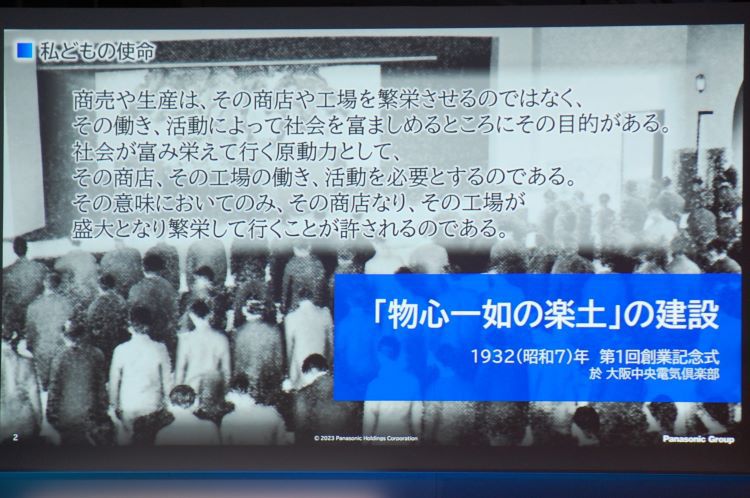 グループが目指す姿は1932年の第1回創業記念式にさかのぼり、「人生の幸福が安定する状態を持続する楽土を築くことが松下電器の真使命。後に『物心一如の繁栄』という言葉で、幸之助創業者が生涯を通じて私どもの目指すところとして示してこられました」と説明した。
