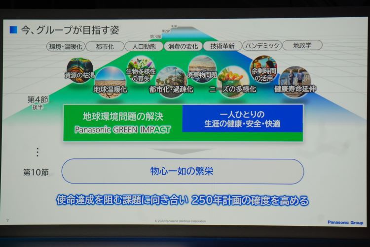 「物心一如の繁栄」を250年で実現する250年計画を掲げ、1節25年として10節(10世代)。現在は第4節(2007年〜2031年)にあたり、「使命達成のタスクを次の時代へつながなくてはなりません。暮らしは豊かになりましたが、阻む課題がまだまだあります」と“地球環境問題の解決”を今のグループの目指す1つ目の姿として挙げ、「温暖化と資源の枯渇は一刻でも早く解決しなければなりません」と強調した。さらに、2つ目の姿として示したのが、高齢化社会を迎えるなか、健康寿命を延伸した“一人ひとりの生涯の健康・安全・快適”だ。