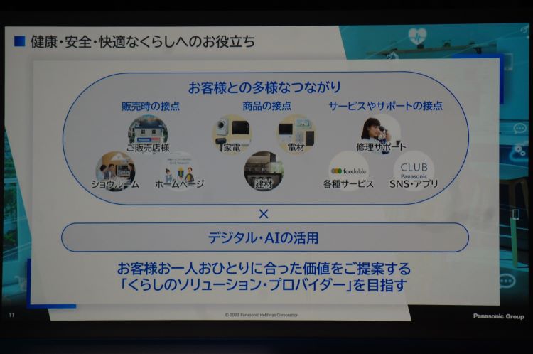 戦略のもう一つの軸となる「お客様お一人おひとりの生涯における健康・安全・快適」に向けた取り組みでは、「パナソニックグループはお客様との多様な接点がございます。ご販売店様をはじめとする商品を販売する上での接点、商品やサービスをお使いいただく上での接点、修理・サポートの接点、こういった多様なつながりのなかで、時々刻々とデータが生まれています。それを統合できれば、よりよい商品やサービスのご提案が生み出せるのではないか。ご販売店様にもより大きなお役立ちができると確信しております」と語り、「多様なお客様、お一人おひとりに合った価値をご提案できる『くらしソリューション・プロバイダー』を目指していきます」と訴えた。