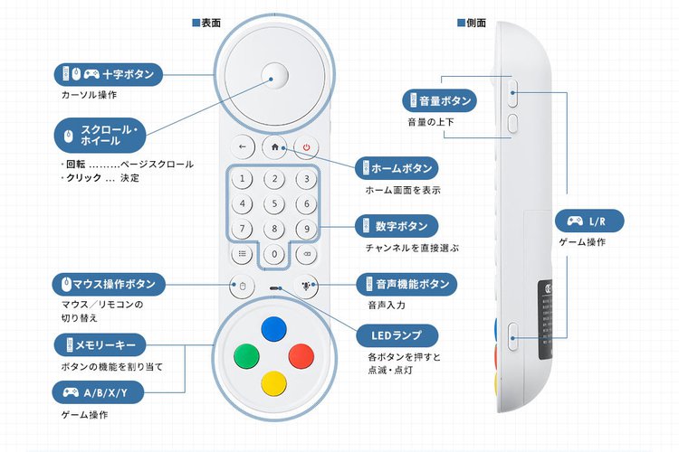 動きを感知するジャイロセンサーを搭載し、手首を動かしてのマウス操作や横持ちしてゲームコントローラーとして使用可能なスマートリモコン。AndroidTVや独自OS搭載型のスマートテレビに対応するほか、パソコンでも使用が可能。通信方法はBluetoothと同梱のドングルによる2.4GHz帯ワイヤレス通信を採用する。