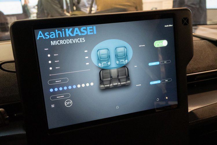 AKMは半導体部品やセンシングデバイスの製造を行っており、それらデバイスが今回のデモ車にも搭載されている。ブースでは、昨年12月に発表した車載用オーディオDSP「AK7018」「AK7017」が評価ボードに載せられた状態でも展示されており、ヘッドホンでサウンドを楽しめるようになっていた。