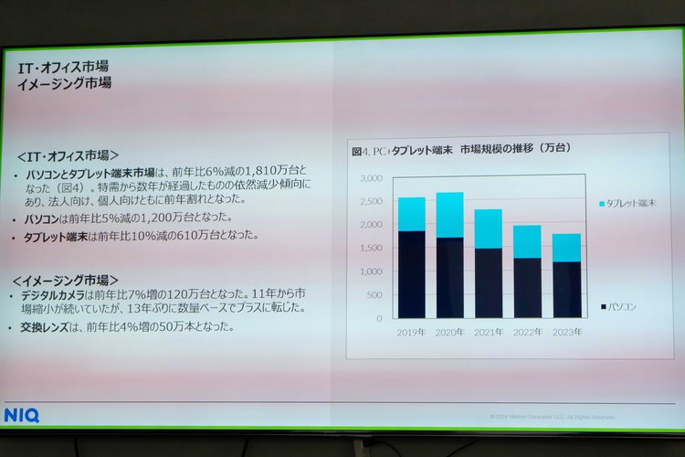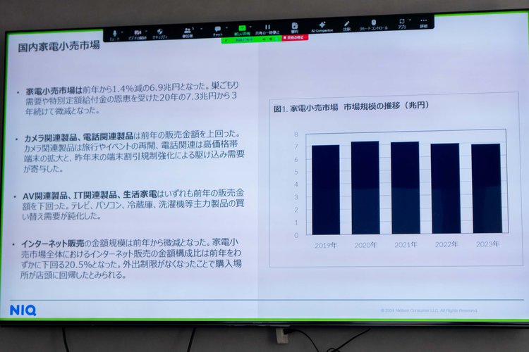 GfK Japanは、全国の有力家電・IT取扱店の販売実績データなどを基にした、2023年の家電およびIT市場の販売動向を発表した。コロナ禍における巣ごもり需要や特別定額給付金の恩恵を受けた2020年は7.3兆円となったが、特需の反動もあり2021年以降の3年は微減傾向が続いており、2023年の家電小売市場は前年から1.4%減の6.9兆円となったという。