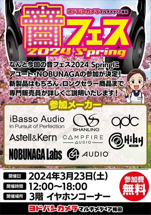 ヨドバシカメラ マルチメディア梅田(大阪市)は、ポータブルオーディオの試聴イベント「音フェス2024 Spring」を、3月23日(土)12時から18時にかけて同店3階イヤホンコーナーにて開催する。参加は無料。