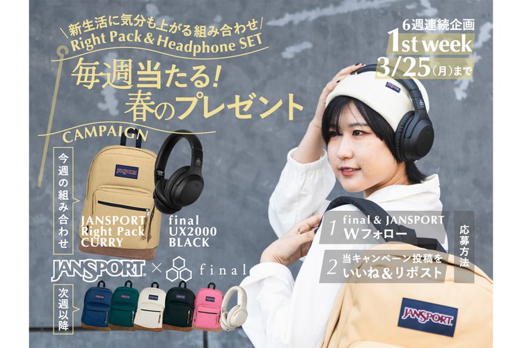 finalは、アメリカのアウトドアブランド・JanSportとのコラボレーションで、finalのノイズキャンセリングヘッドホン「UX2000」1点とJanSportのデイパック「Right Pack」1点のセットが計12名に無料でプレゼントされる「final×JanSport 春のプレゼントキャンペーン」を開催する。