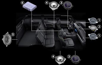 スピーカー構成は、インパネサイドに9cm CST(Coherent Source Transducer)を2基、インパネセンターに9cm ミッドレンジを1基、フロントドアに18cmウーファー、リアドアに16cmフルレンジを2基ずつ、バックドアに20cmサブウーファー1基を備える。