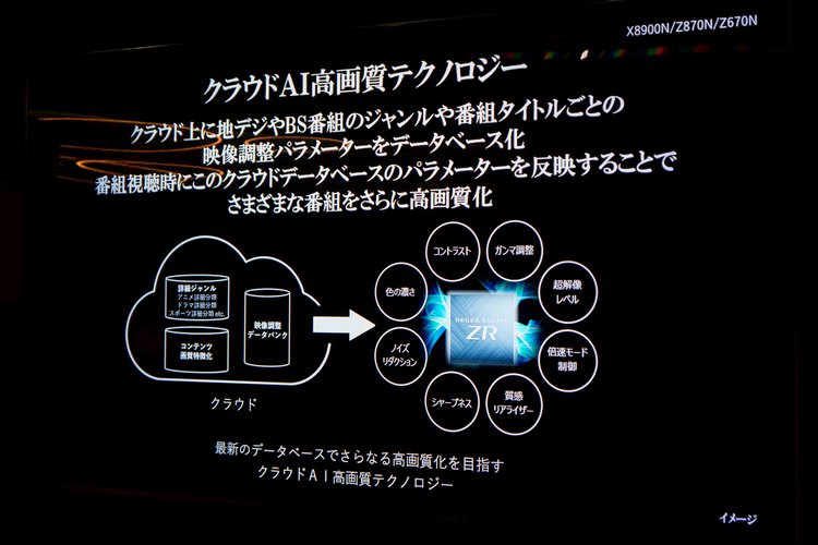 放送番組で効果を発揮する映像技術「地デジAIビューティ」では、地デジやBSの放送番組のノイズ抑制をはじめ、精細細感復元技術などを施すことで高画質化を図っている。クラウド上にデータベース化した地デジやBS番組のジャンルや番組タイトルごとの映像調整パラメーターを、視聴中の放送番組の映像に反映することで、最適な高画質処理を可能とする「クラウドAI高画質テクノロジー」も備える。