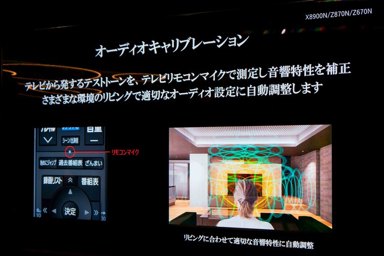 サウンド面の機能として、テレビを置いている環境の音響特性をテレビリモコンマイクで測定し、室内音響特性に適したサウンドに自動調整する「オートキャリブレーション」も採用する。サウンドモードには、「スポーツ」が新たに追加されており、スタジアムにいるような歓声の聴こえ、音の広がりや響きを得られるという。