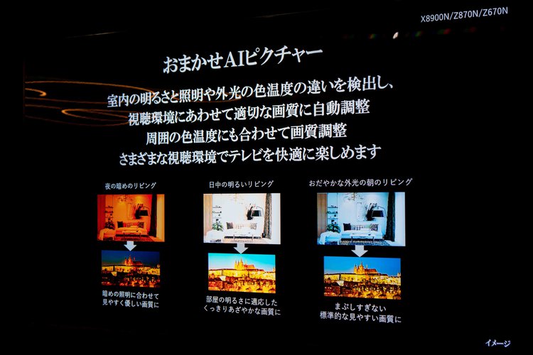 視聴環境の明るさや照明を検知して映像バランスの最適化を自動で行う「おまかせAIピクチャー」も採用。また2023年のフラグシップ4Kテレビに採用していた、室内照明の色温度の違いを認識してホワイトバランスを自動調整する機能も追加された。
