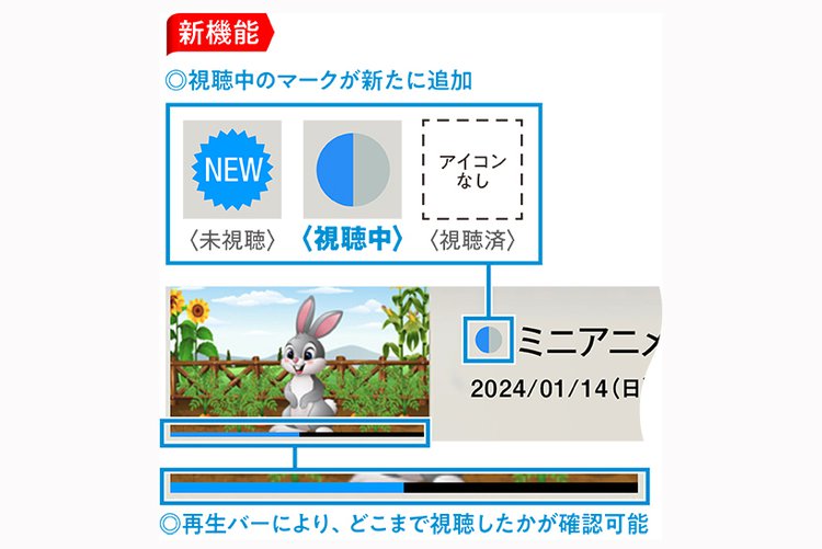 本モデルは、「あなたの“好き”を逃さない」をコンセプトとし、録画番組を効率よく見るための機能を進化させている。録画番組をどこまで見たか、視聴済みかなど視聴状況を一目で判断できるよう、未試聴/視聴中/視聴済が確認可能な視聴マークと、再生バーから最終視聴位置を目視できる機能を新たに搭載している。