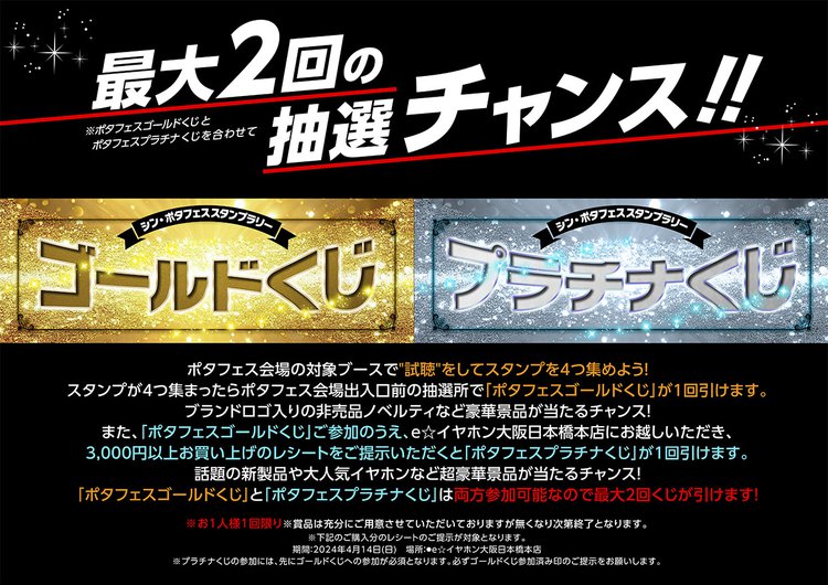 会場では豪華商品が当たるスタンプラリーも実施。対象ブースで試聴をしてスタンプを4つ集めると、抽選でブランドロゴ入り非売品ノベルティなどが当たる「ポタフェスゴールドくじ」を1回引くことができる。さらに、ポタフェスゴールドくじに参加のうえ、当日中にe☆イヤホン大阪日本橋本店で3,000円以上購入し、レシートを提示した方は、抽選で話題の新製品や大人気のイヤホンなどが当たる「ポタフェスプラチナくじ」を1回引くことが可能だ。