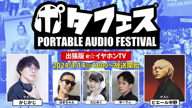 当日、ポタフェス会場では13時より『出張版 e☆イヤホンTV』のYouTubeライブ配信を行う。ゲストには、e☆イヤホン公式アンバサダーであるピエール中野さん、様々な媒体でイヤホンやオーディオガジェットを紹介しているYouTuber兼ブロガーのカジェログ(かじかじ)さんを迎え、ポタフェス出展ブランドの注目製品などを特集する。ライブ配信後はアーカイブ配信も行われる。