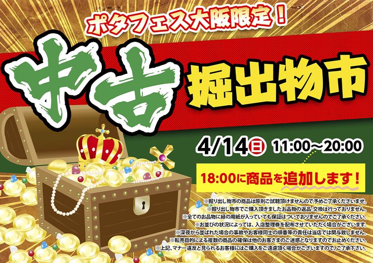 ポタフェス当日、e☆イヤホン大阪日本橋本店では、2Fにて「中古掘り出し物市」を開催する。また、ポタフェス会場で配布される冊子に、同店で使用可能な中古商品5%オフクーポンを掲載。さらに店頭買取限定で、通常査定では減額の対象となる付属品欠品の減額を0円にするキャンペーンも行われる。