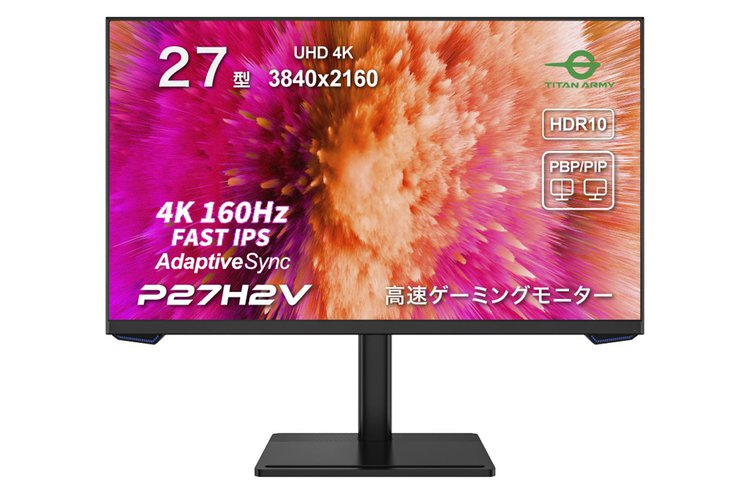 P27H2Vは、4K(3840×2160)の高解像度と160Hzのリフレッシュレートに対応する27型モデル。HDMI2.0端子を2基備え、ゲーミングPCのみならずPS5といったゲーム機でも4K/120Hzによる高画質で滑らかなゲームプレイが楽しめるという。