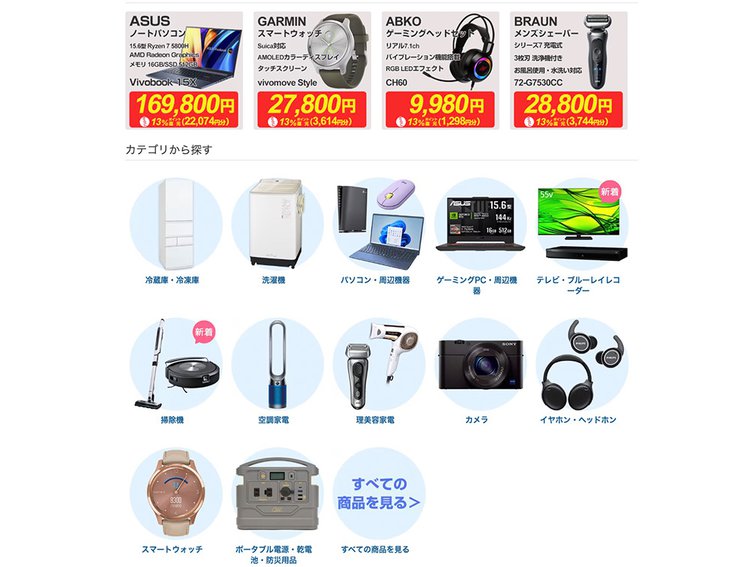 そのセール品の内容だが、AmazonのスマイルSALEの対象商品とは、良い意味で“被り”が少なく、明らかにヨドバシの方が安い商品が多くなっている。さらにヨドバシ.comは、5月6日まで、通常10%ポイント還元商品の多くを13%ポイント還元している。販売価格がAmazonに比べて安いのはもちろん、それに加えて大きなポイント還元も行われるとあって、とてもお得な状況になっている。