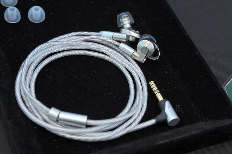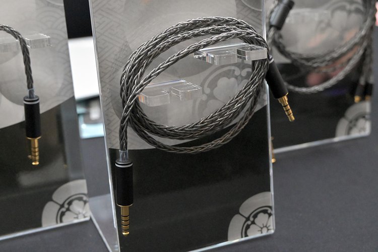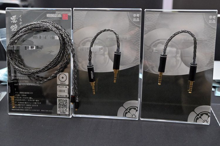 NOBUNAGA Labsは同社が展開する各種イヤホン/ヘッドホンケーブルの主力モデルを展示。加えて、導体に高純度無酸素銅と銀を組み合わせた“NOBUNAGA Labs COMBINEシリーズ”から、開発中の製品4点を参考出展した。