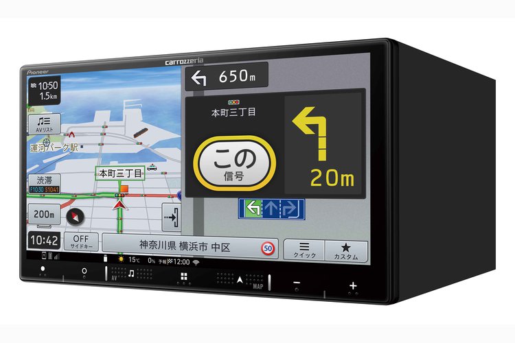 ナビゲーション機能として、交差点までの残りの信号数をカウントダウンする「信号機カウント交差点案内」、楽ナビ史上最速の検索を誇る「ルート検索」、渋滞予測でやリアルタイムの走行・交通情報を分析して最適な渋滞情報を提供する「スマートループ渋滞情報」に対応する。