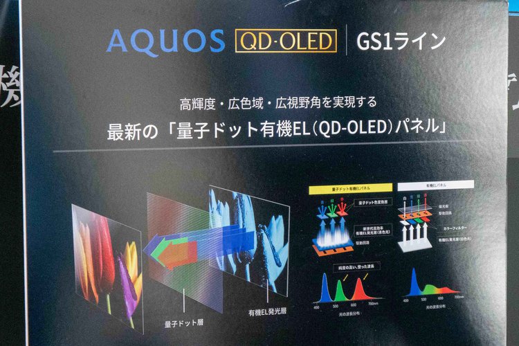 本シリーズは、同社の4K有機ELテレビで初めてQD-OLEDが採用された2023年度モデル「FS1ライン」の後継機で、「AQUOS QD-OLED」の第2世代機種となる。最新世代の量子ドット有機ELパネルを搭載し、高輝度、広色域、広視野角を実現しているという。QD-OLEDは、最新の高効率を誇る青色光の有機EL発光層に、光波長変換を行う量子ドット層を組み合わせたパネルで、通常の有機ELパネルよりも純度の高い色表現で、高い輝度の映像でも豊かな色再現を実現する。
