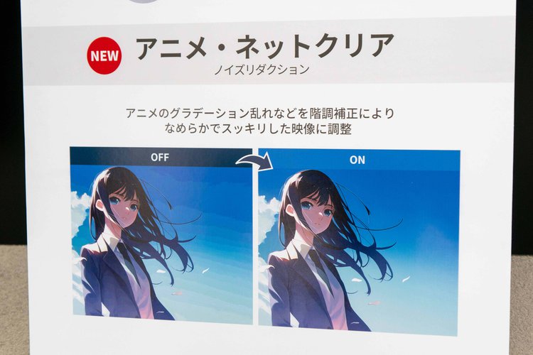 ノイズ低減機能の「アニメ・ネットクリア」ではデジタル圧縮によって発生しやすい背景のバンディングや被写体にのってしまうブロックノイズを低減することができ、階調補正が施された、なめらかですっきりとした映像表現を可能にするという。