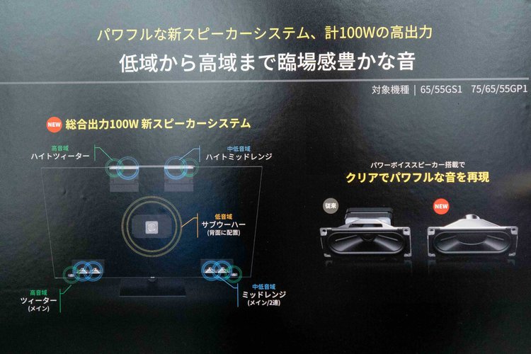 ハイトスピーカーはより立体的な音響効果に繋がる前傾20度のセッティングになっており、音抜けと広がり感を高めるために「広開口金属パンチングネット」を採用。そして新搭載のパワーボイススピーカーはクリアでキレの良いサウンドに繋がっており、前向きトゥイーターは前面開口のリフレクター構造にすることで直接音をクリアに届ける仕組みにするなど、細部に渡って高音質技術が施されている。立体音響フォーマットはDolby Atmosに対応。音響補正技術「Eilex PRISM」も搭載する。