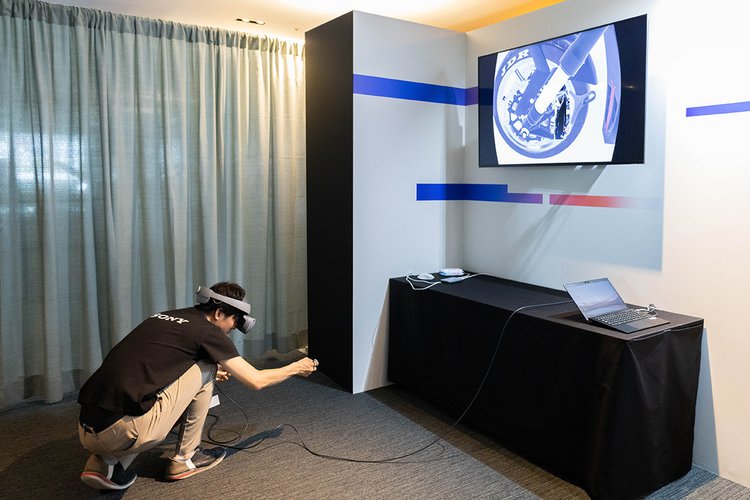 会場では、ヘッドマウントディスプレイを活用した3DのCADソフトウェア操作の実演デモンストレーションなども行われた。CADソフトとして知られるシーメンスと協業し、たとえばバイクのCADデータを、三次元空間上で直感的に作成できるといったもの。両手に装着できる触知デバイスもセットになっており、右手でパーツを掴み、左手でサイズを調整するといった使い方もできる。