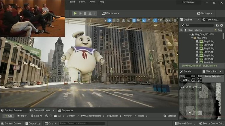 Epic Gamesの「Unreal Engine」は、“リアルタイムのコンピューティング技術”に大きな強みを持つ。Unreal Engineを活用し、スポーツにおける現実の選手の骨格の動きをリアルタイムに捉える事例や、ゴースト・バスターズのマシュマロマンの俳優の動きをモーションキャプチャーし、3Dの街並みに重ねて撮影するといった事例を紹介した。