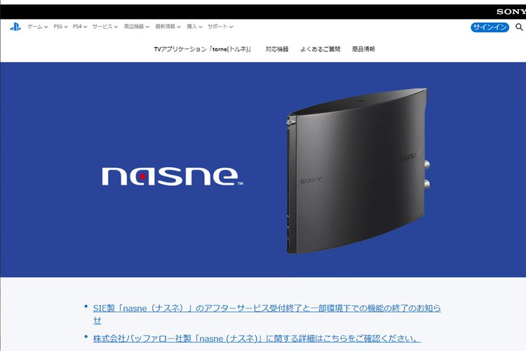 2016年に発売された同社製nasne「CUHJ-15004」のアフターサービス終了に伴って発表されたもの。PS5版torneアプリや、torne mobileにおいて宅内・宅外でのTV番組視聴、録画ビデオの再生といった一部機能が、2027年7月末以降使用できなくなる。
